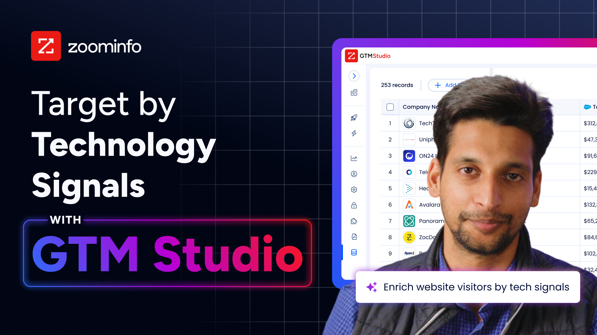 Inside GTM Studio, you can enrich the imported contact list with ZoomInfo’s technology signals.